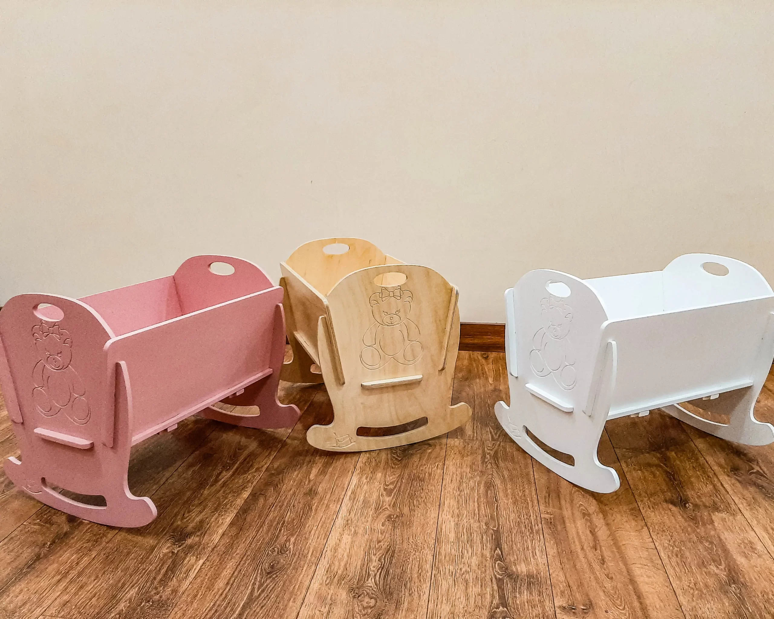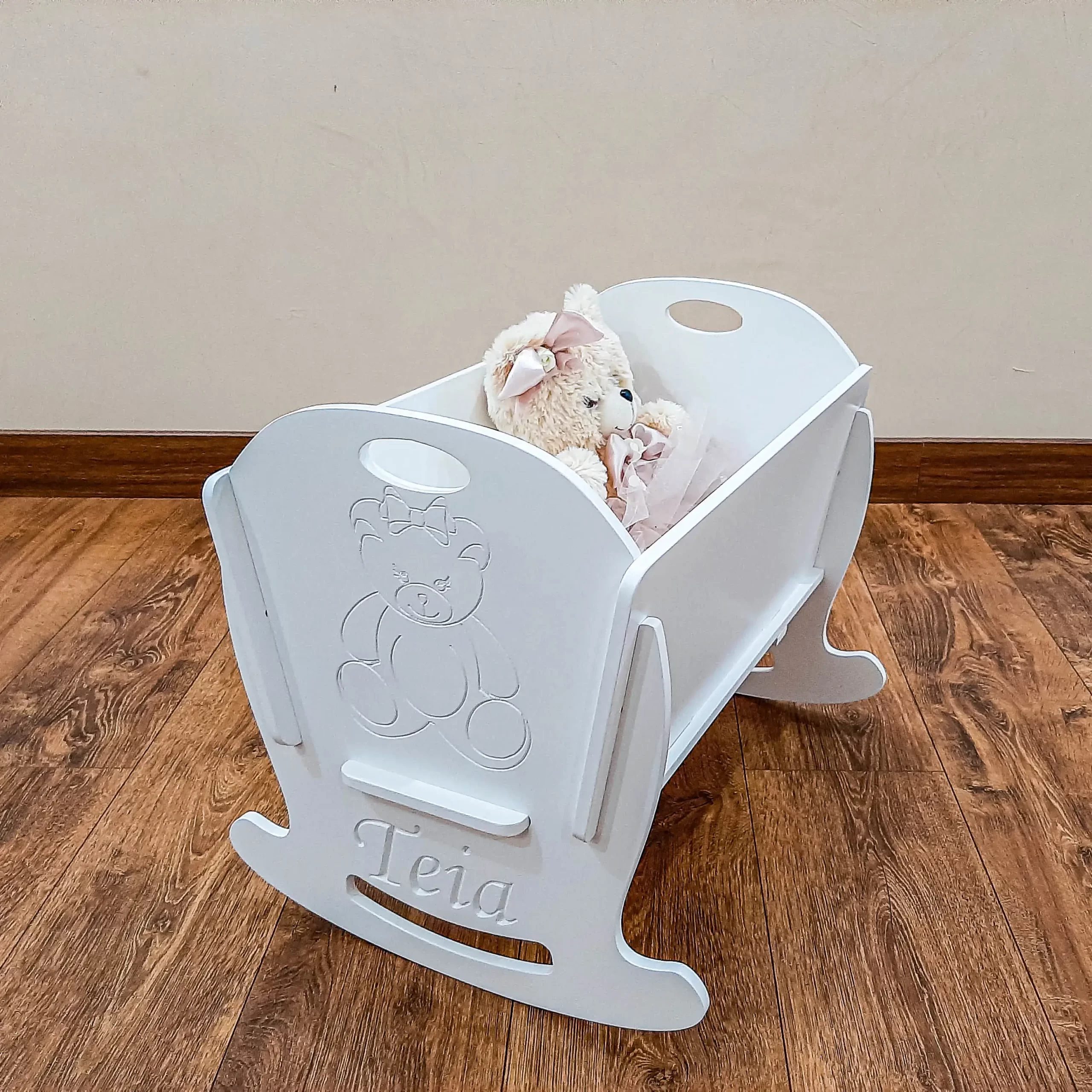 Jucăria dezvoltă sensibilitatea și grija copilului. Leagănul este realizat 100% din placaj (lemn), iar stratul protector de vopsea este ecologic și antialergenic pentru copii. Marginile rotunjite minimalizează riscul leziunilor, garantând siguranță celui mic. Designul leagănului poate fi modificat, prin gravarea unui nume sau o oricărei alte inscripții.