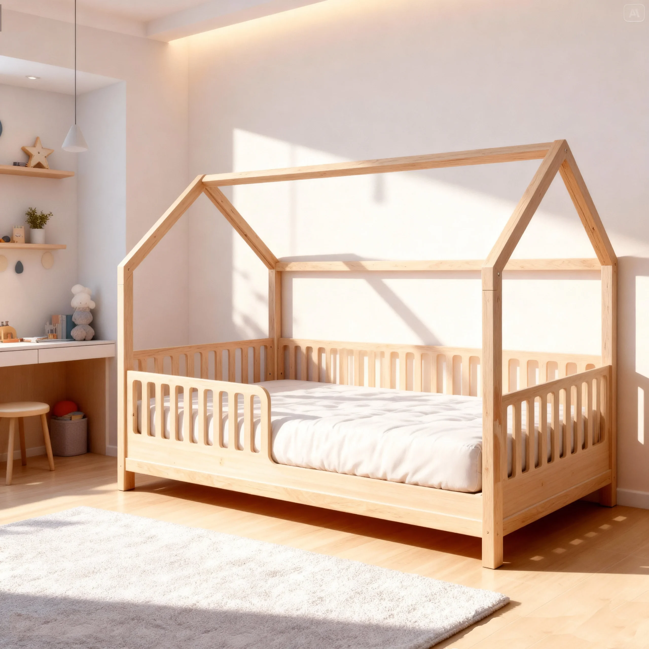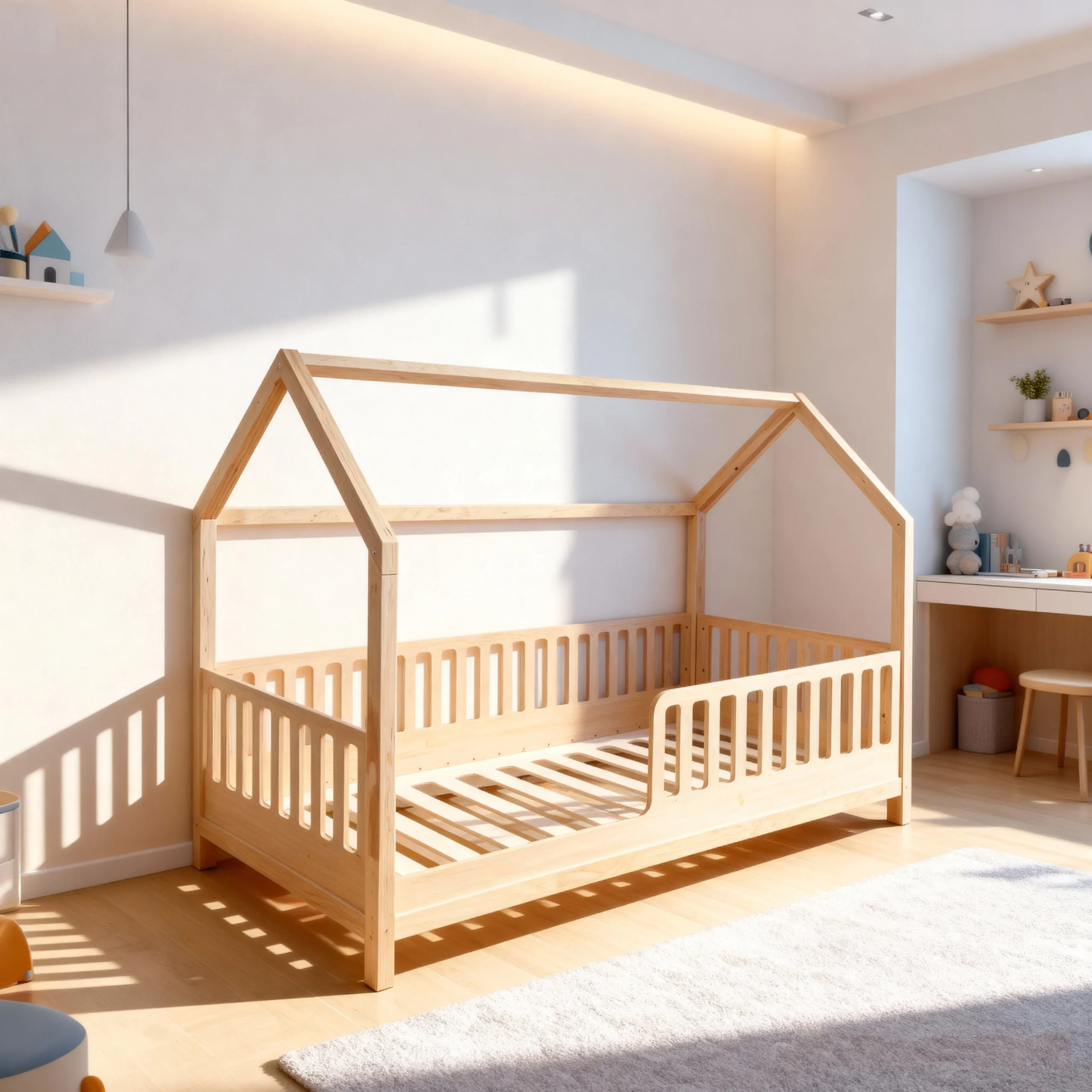 Pat Montessori Iani Nani aduce siguranță și confort copilului tău. Acest pat căsuță din lemn natural este ideal pentru orice cameră de copii. Prin urmare, vei oferi celui mic un spațiu sigur și vesel pentru joc și somn.
